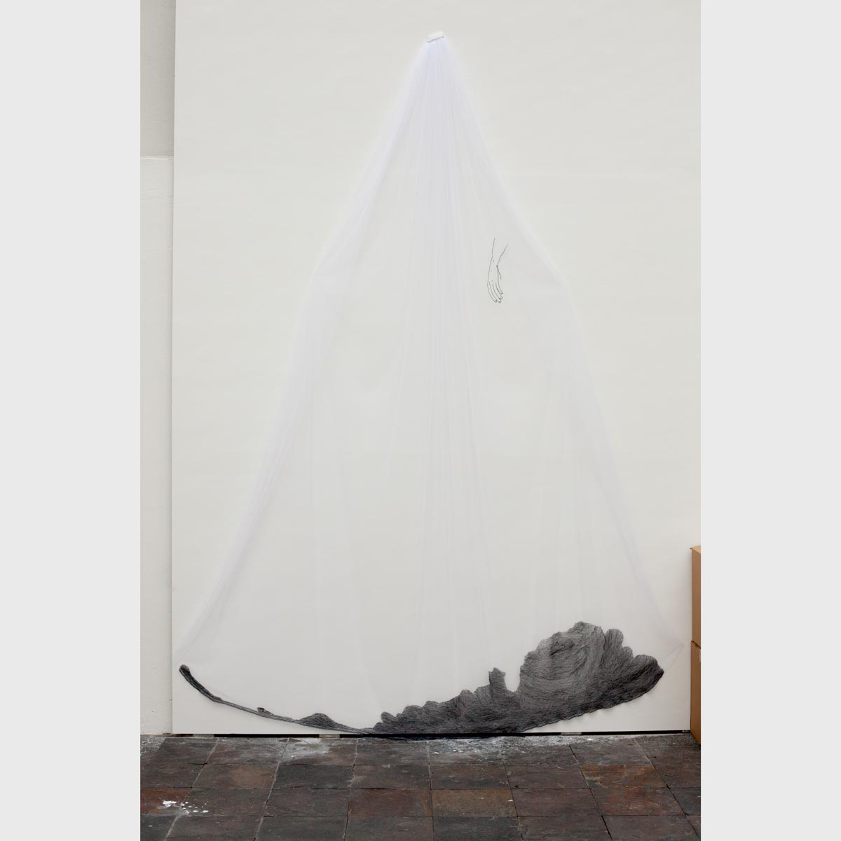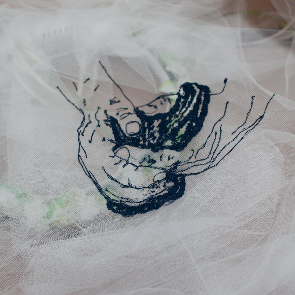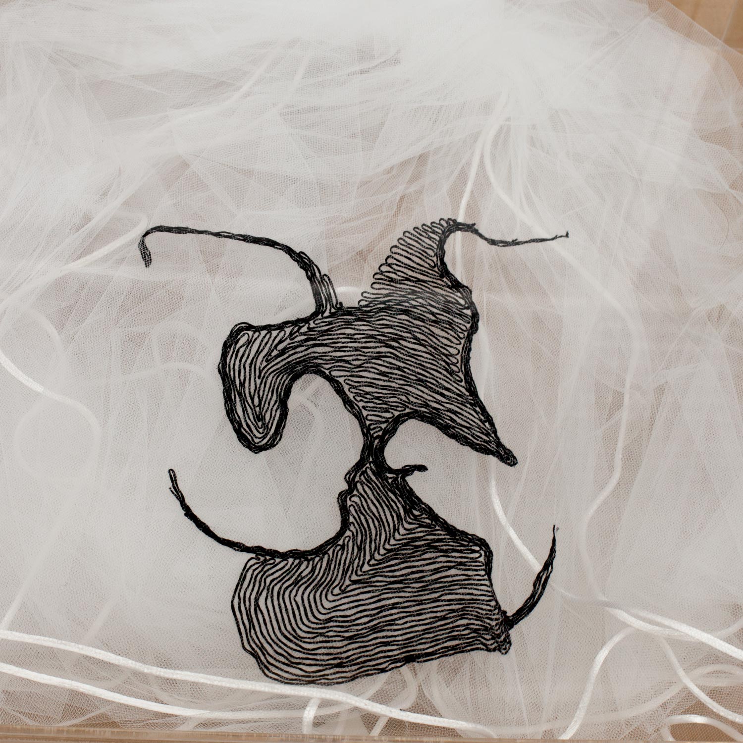 Esta parte del proyecto se materializo con 12 velos bordados en hilo negro, evocando el transcurrir del tiempo en un objeto que se usa sólo una vez y finalizada la ceremonia es guardado para recordar el evento.