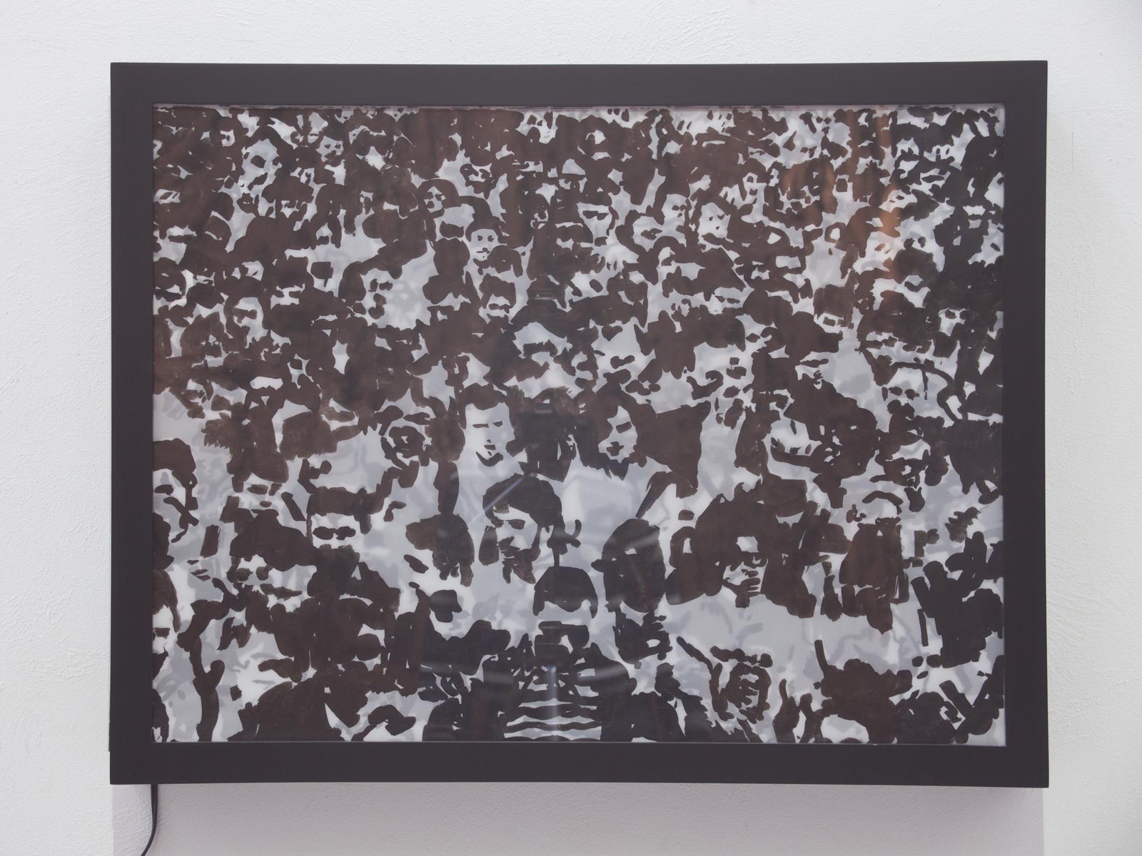 (De lo anónimo de la turba a la aparición del individuo): En estos cuatro dibujos se hace un proceso de selección pasando de los anónimos de la turba hasta llegar a un acercamiento donde aparece el concepto de individuo.