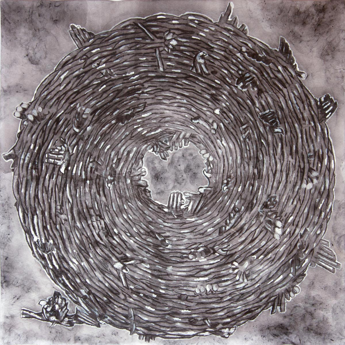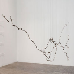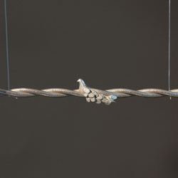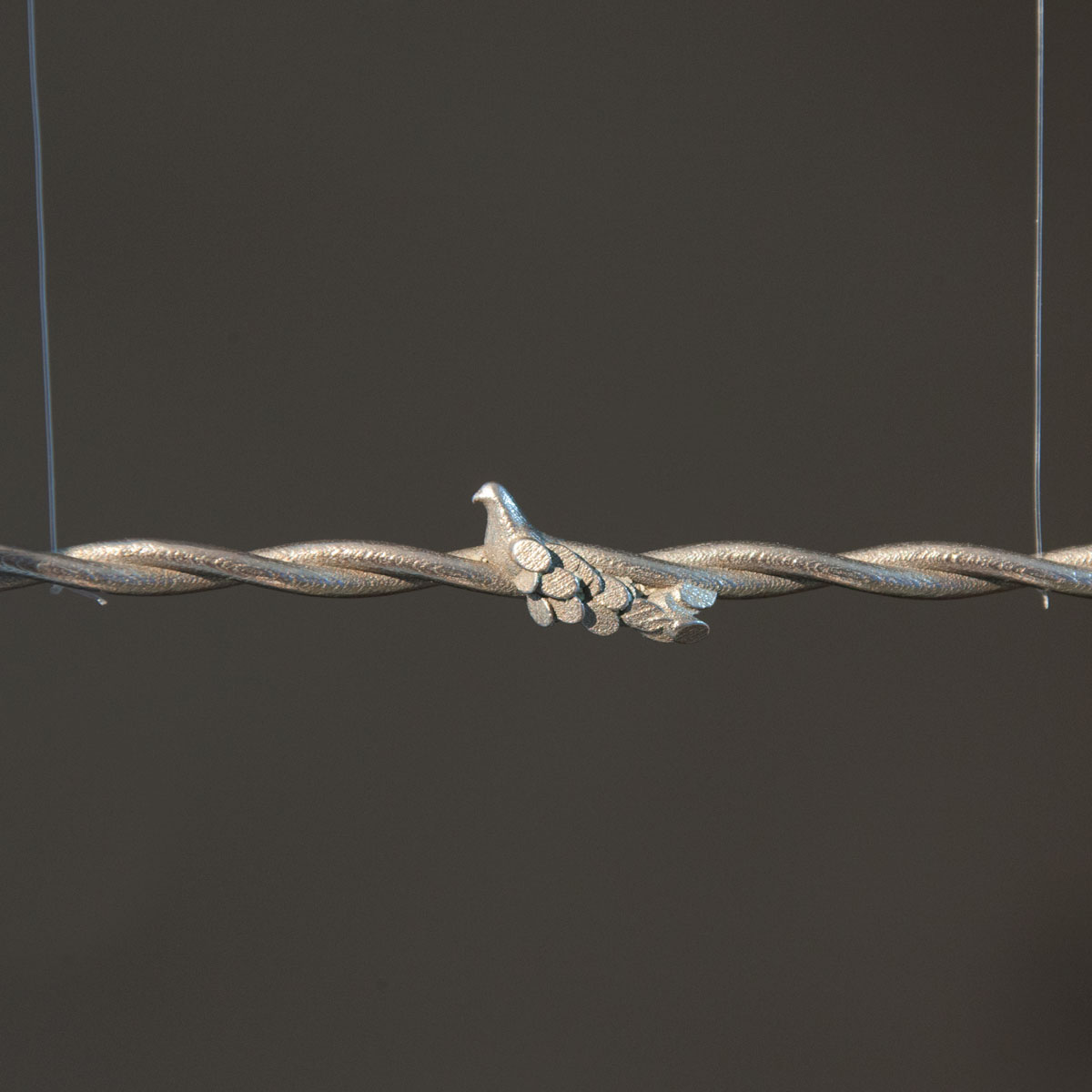 Al frente de este, está construida otra cerca de pájaros, con las mismas 132 piezas, pero esta vez hechas en acero y dispuestas con un patrón más orgánico que cuelga del techo.
