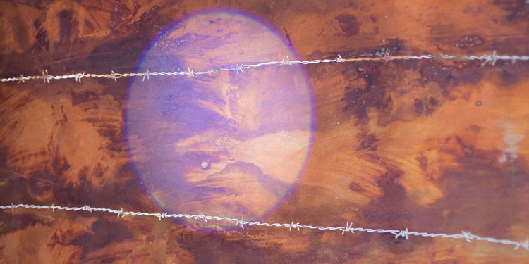 En esta obra tenemos dos puntos de vista que podrían verse a través de una cerca alambrada. El primero lado Rural oxidado y el lado opuesto Urbano brillante.